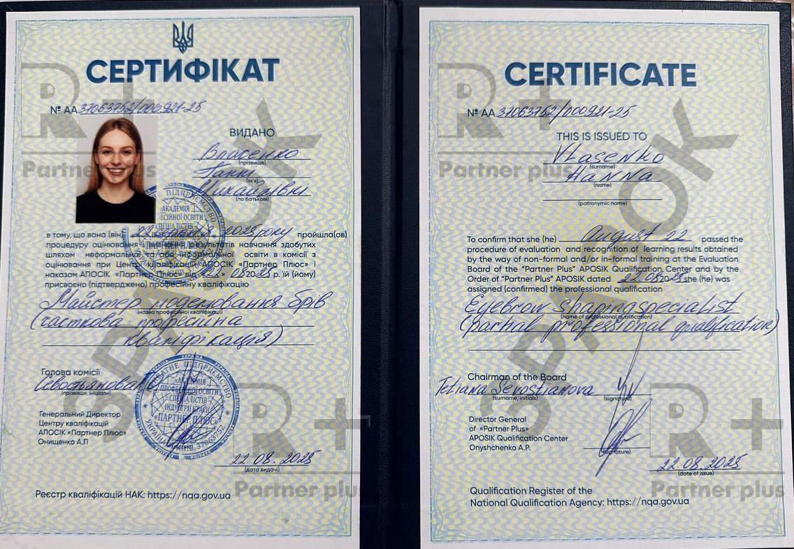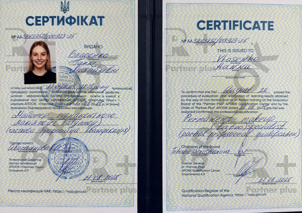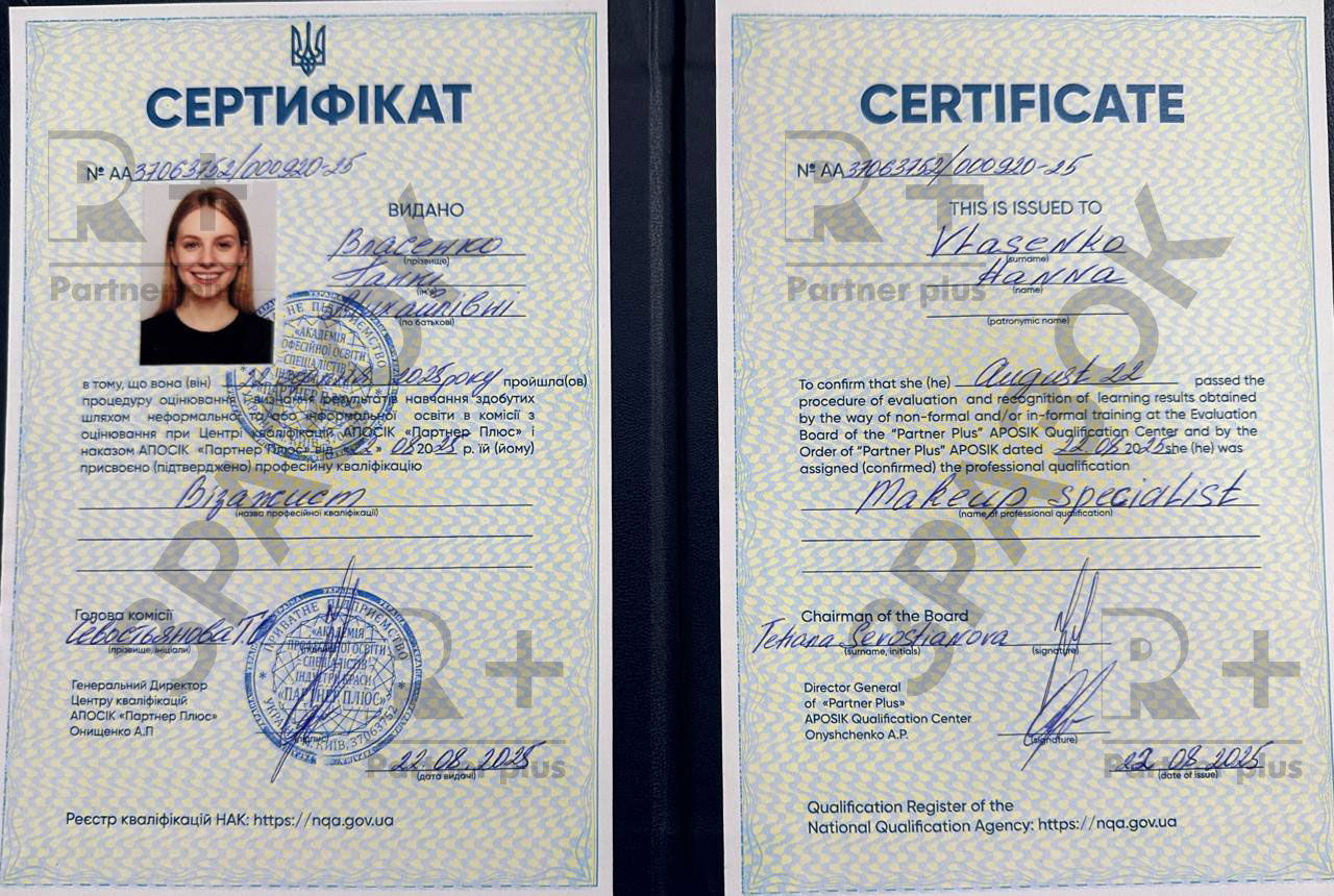 - Центр кваліфікацій «Партнер Плюс» має Державну Акредитацію №105 – №115 від 11.2023 та № 235 від 11.07.2024 і уповноважений від імені Держави здійснювати оцінювання і визнання результатів навчання осіб, зокрема здобутих шляхом неформальної (навчання в салоні краси чи при майстрі) або інформальної освіти (самоосвіти), та присвоювати професійні кваліфікації Beauty-майстра.